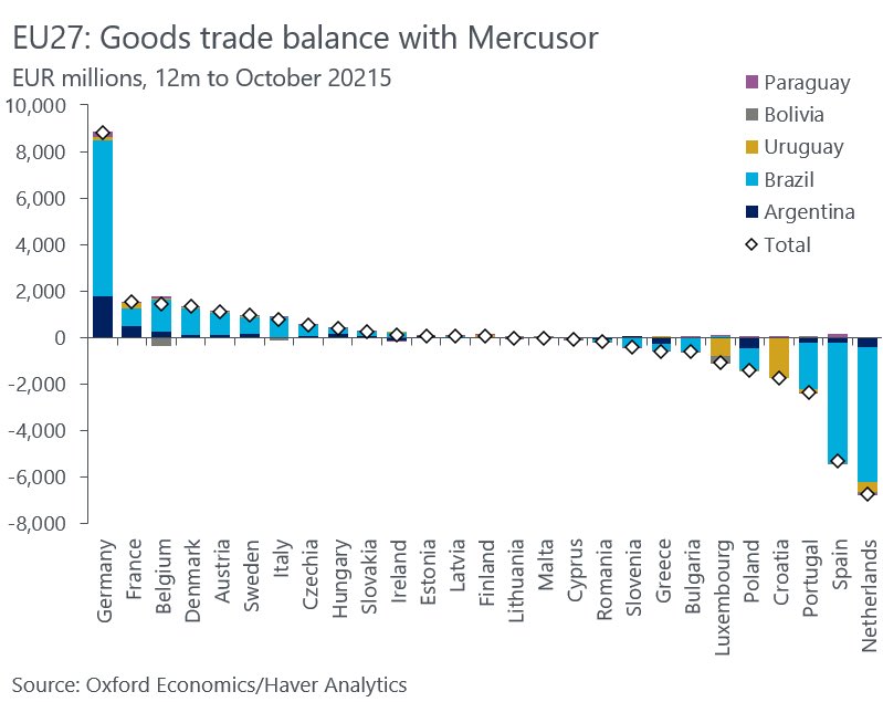 Según un análisis de Oxford Economics y Haver Analytics, basado en la balanza comercial de bienes entre la UE y Mercosur (doce meses hasta octubre de 2025), Alemania es el país claramente más beneficiado del intercambio, con un superávit cercano a los 9.000 millones de euros. Su economía, fuertemente orientada a la exportación industrial —automoción, maquinaria y productos químicos—, encuentra en Mercosur un mercado favorable tras la reducción de aranceles y barreras comerciales.